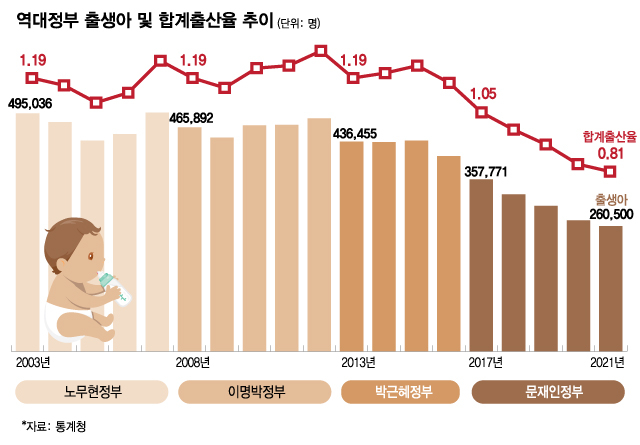 정부에서는 당연히 인구통계학적 문제점을 인식했기에 막대한 예산을 투입했다. 지난 정권인 문재인 정부가 5년간 쓴 저출산 대책 예산은 2017년 20조였던 것이 2021년에는 43조로 무려 2배 이상이 늘어났다. 2021년 한 해 예산 총 지출의 7.1%가량이 저출산 대책에 쓰였다. 그런데 출산율은 앞서 서술한 바와 같이 세계 최저인 0.8을 달성했다. 참으로 놀라운 성과가 아닐 수 없다.